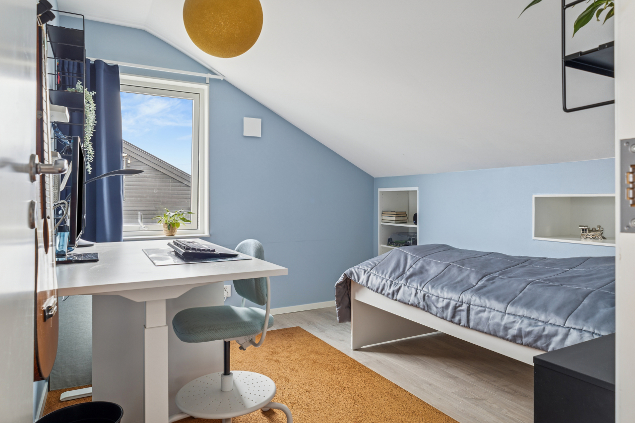 I anslutning till allrummet finner vi två nästan identiska sovrum, belägna vägg i vägg – perfekta som barnrum. Här finns gott om plats för både säng, skrivbord och förvaring, vilket skapar en trivsam och funktionell miljö för lek, studier och vila. Båda rummen har ljusa, målade väggar och erbjuder extra förvaringsmöjligheter i de smart utnyttjade kattvindarna.
