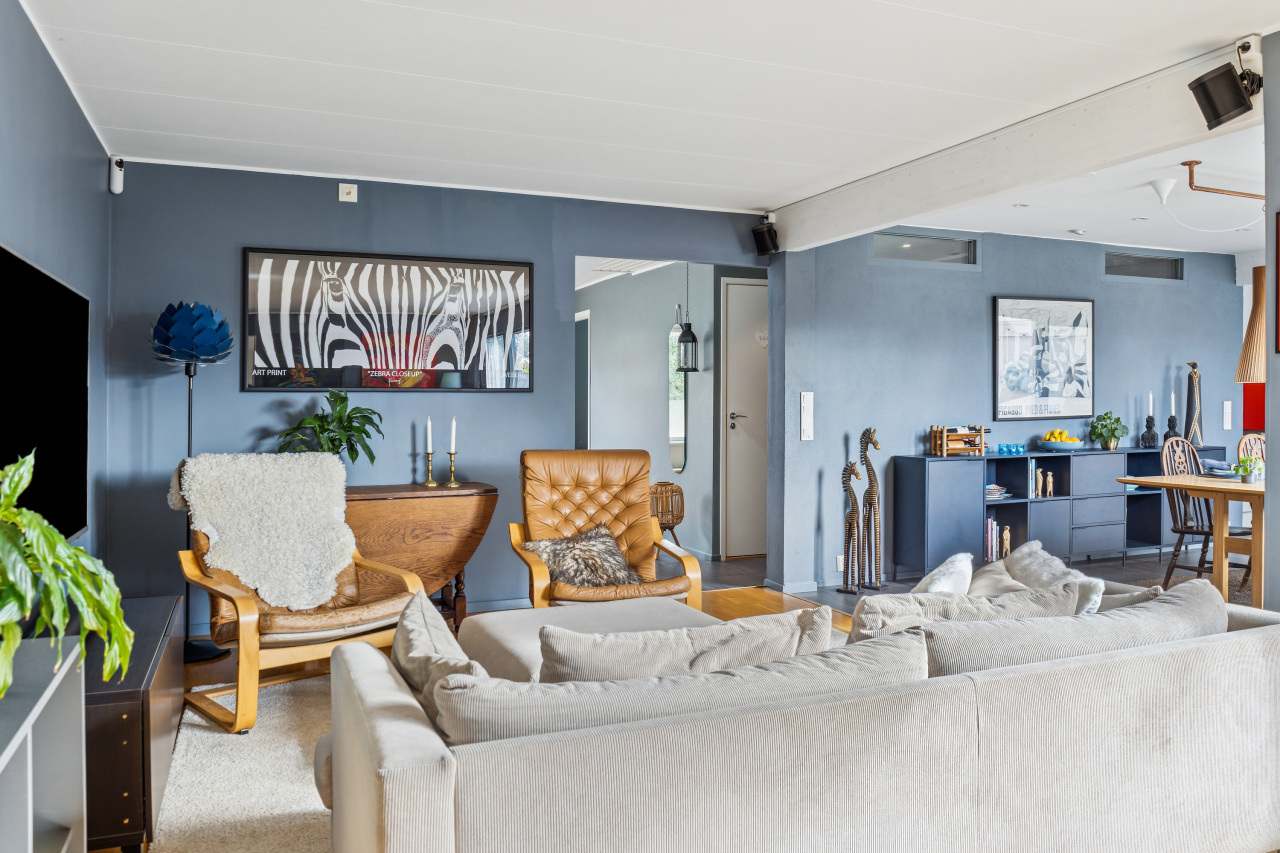 Tillbaka genom köket når vi det rymliga vardagsrummet med flera fönster som ger ett härligt ljusinsläpp, samt utgång till altanen. Här finns gott om plats för både en soffgrupp och ett extra matsalsbord om så önskas.