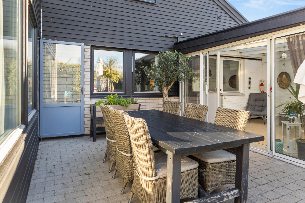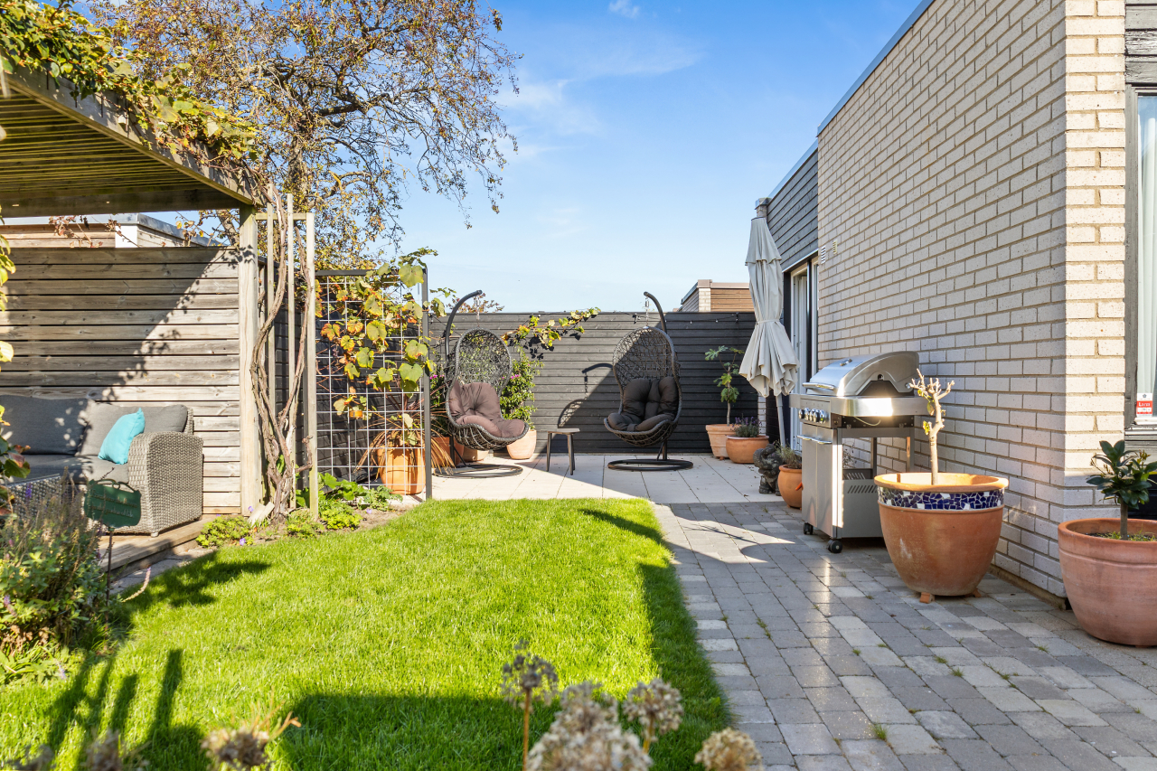 På baksidan öppnar sig en solig och insynsskyddad oas med både uterum och en charmig pergola där slingrande vindruvor pryder taket, en naturlig samlingsplats för familj och vänner. Trädgården är smakfullt utformad med en mindre gräsmatta, prunkande rabatter fyllda av hortensia, lavendel och klätterväxter samt en skyddande mur.