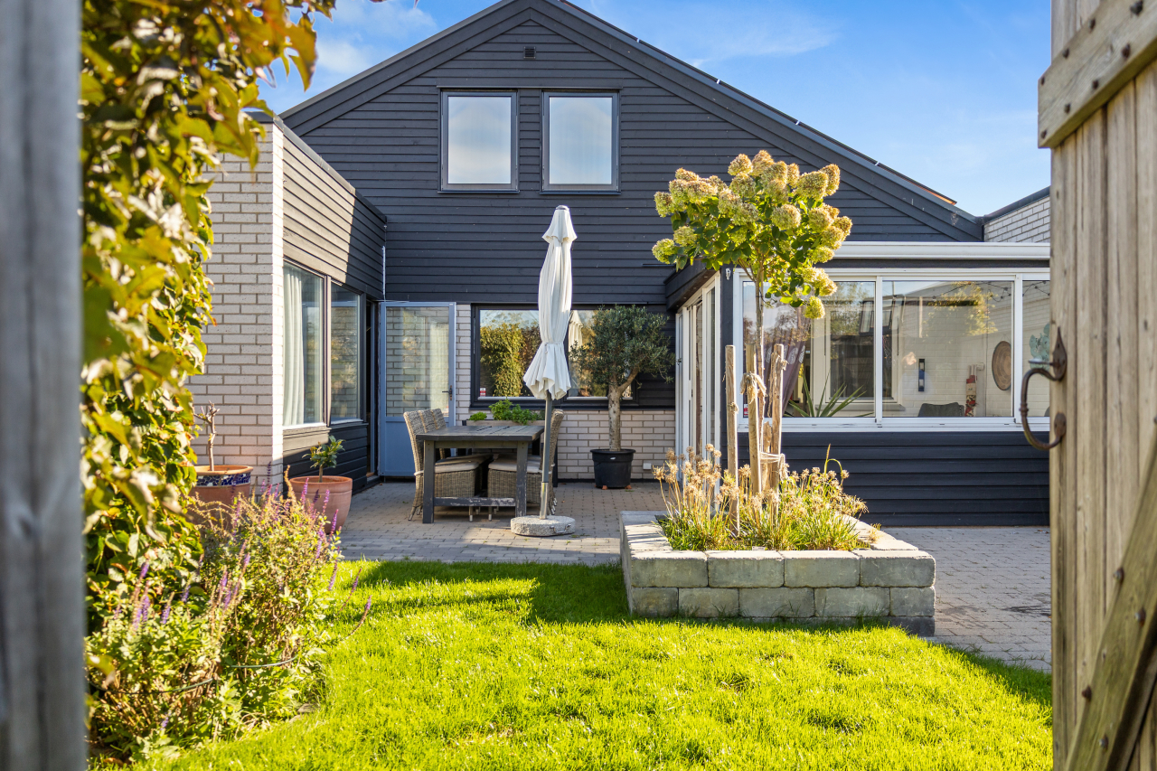 För den som vill ha mer plats för lek och rörelse finns en grind som leder direkt ut till en härlig grön yta alldeles vid tomtgränsen. Dessutom finns ett praktiskt redskapsskjul som ger extra förvaringsmöjligheter. Här får du en utemiljö som förenar både det praktiska och det vackra.